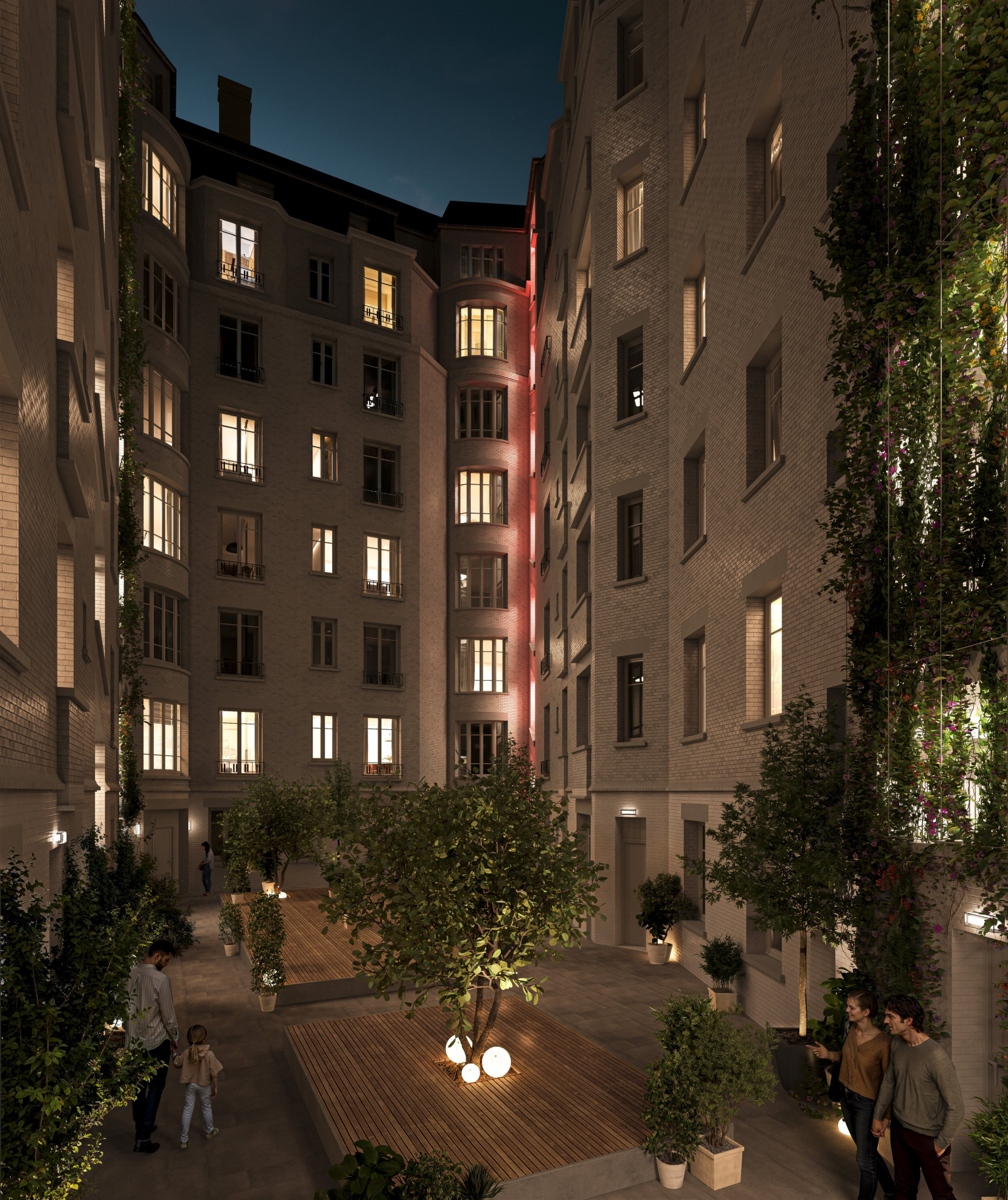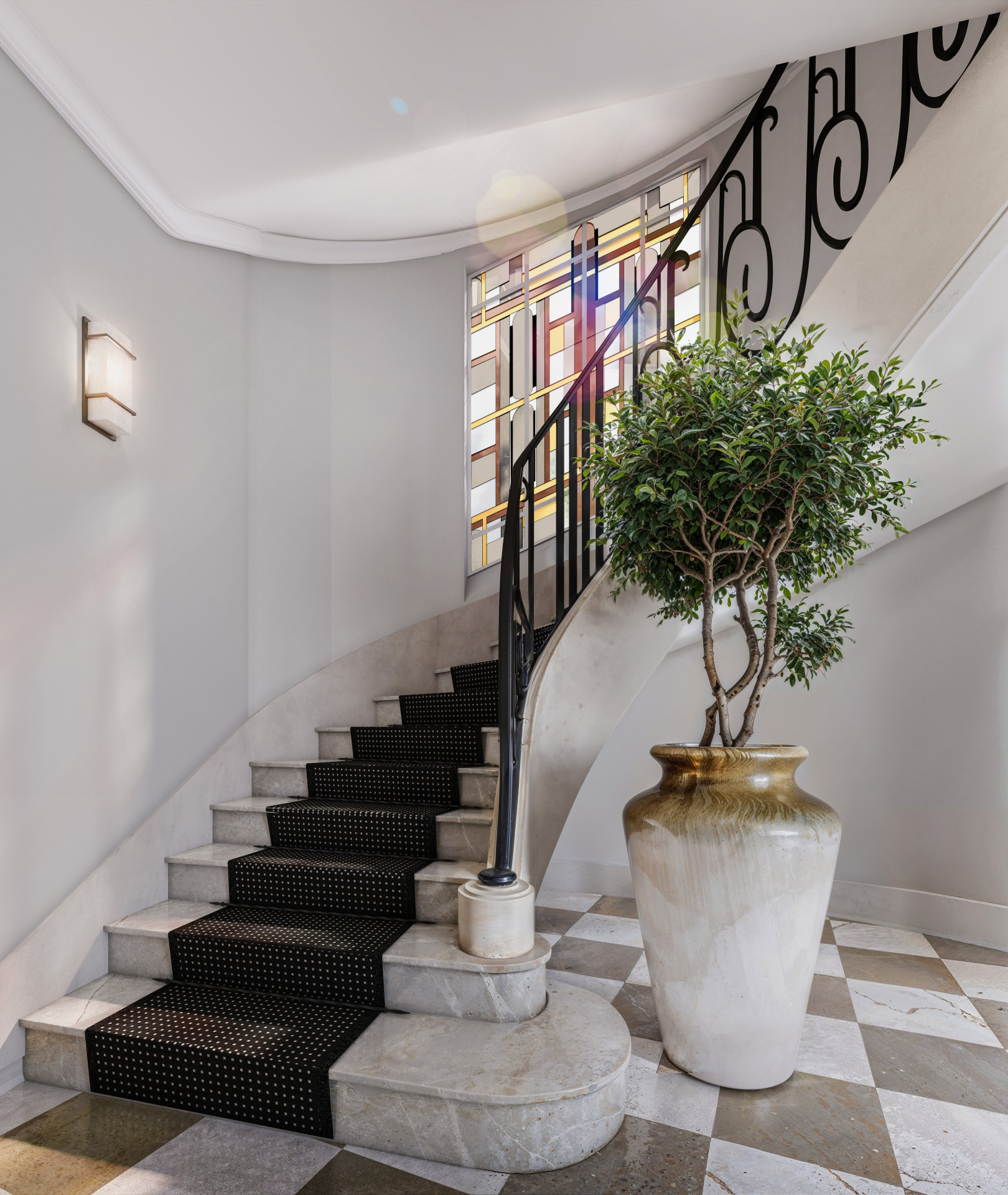 La rénovation des parties communes de l'immeuble apporte la touche de modernité, de confort et de verdure tout en respectant le luxe de l'ancien.