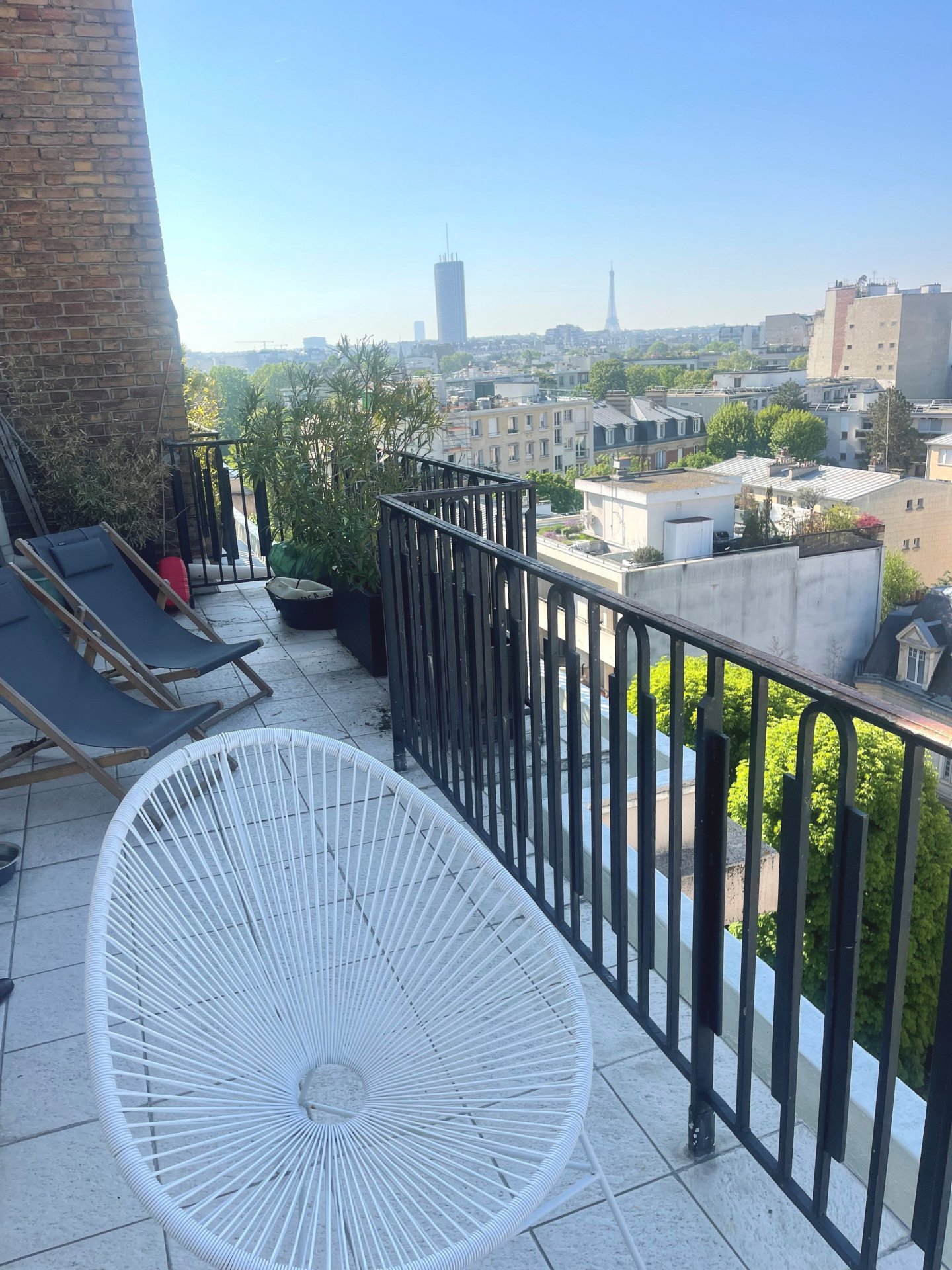 Neuilly Chauveau, dans un très bel immeuble sécurisé en pierre de taille, un appartement situé au dernier étage et doté d'une superficie de 120m² Loi Carrez + deux terrasses exposées Sud Ouest (26m²).